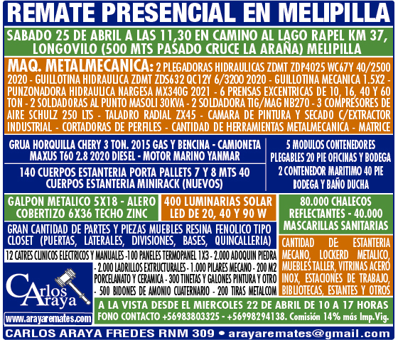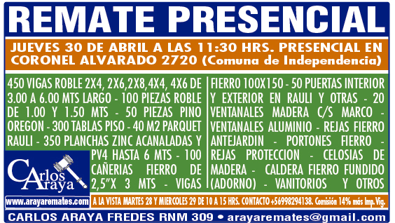 TRANSFERENCIA: Banco Santander, Cta. cte. 67007328, Carlos Araya Fredes, Rut. 9.212.239-5, arayaremates@gmail.com